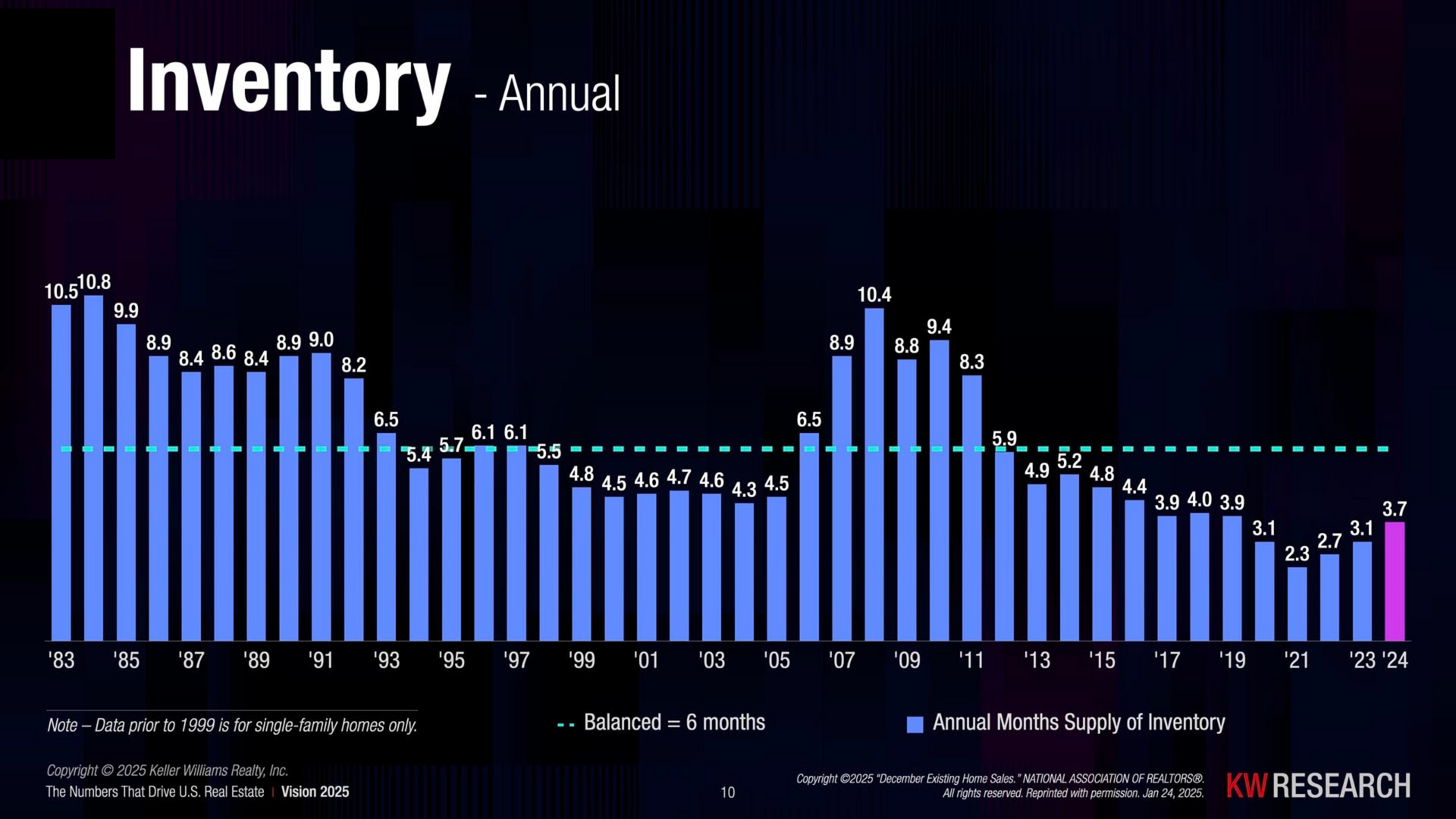 Inventory increased slightly from 2023 but remains historically low, with only 3.7 months of supply compared to the 6 months needed for a balanced market. This shortage keeps demand high, pushing prices upward. If you're thinking about selling, now is a great time, especially before the spring rush. For buyers, inventory is slowly trending toward a balanced market, but competition remains strong. Be prepared to act fast and make sure you’re pre-approved to stay competitive.