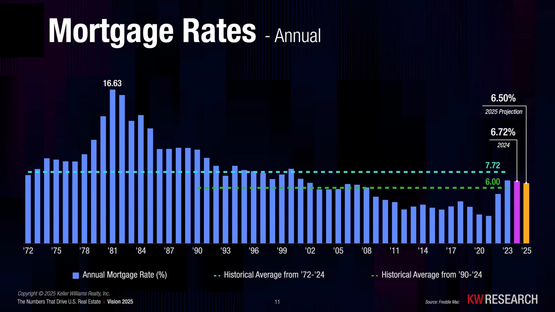 Despite early predictions of declining mortgage rates, 2024 saw fluctuations, averaging 6.72%. While these rates feel high compared to recent lows, they are still below the historical average of 7.72%. In 2025, mortgage rates are expected to stabilize around 6.5%, providing more certainty and potential